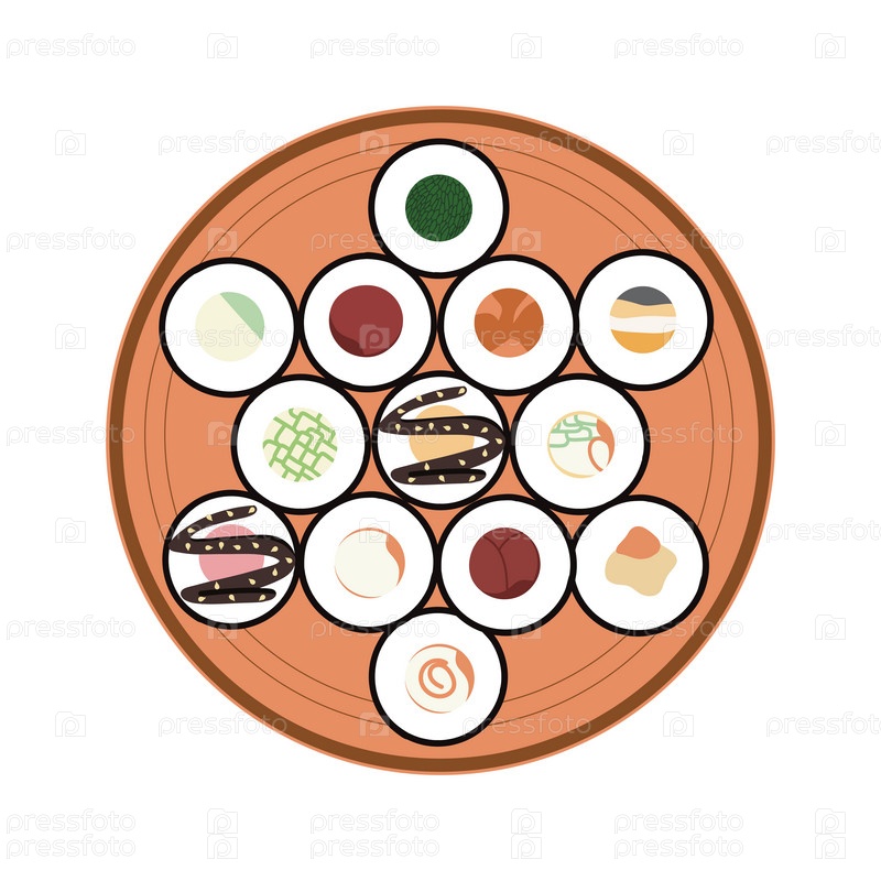 Векторный набор иконок вкусных цветных суши-роллов. Традиционная японская еда
