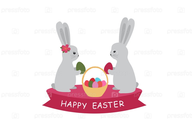 Счастливой пасхи открытка. Иллюстрация с милыми кроликами и яйцами. Векторная иллюстрация на белом фоне