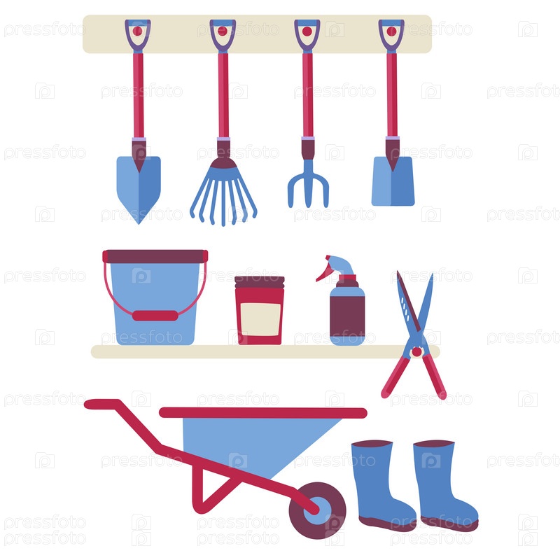 Набор различных инструментов для сада и дачи: грабли, лопаты, ведро, ножницы, семена, тачка, резиновые сапоги. Яркая иллюстрация на белом фоне
