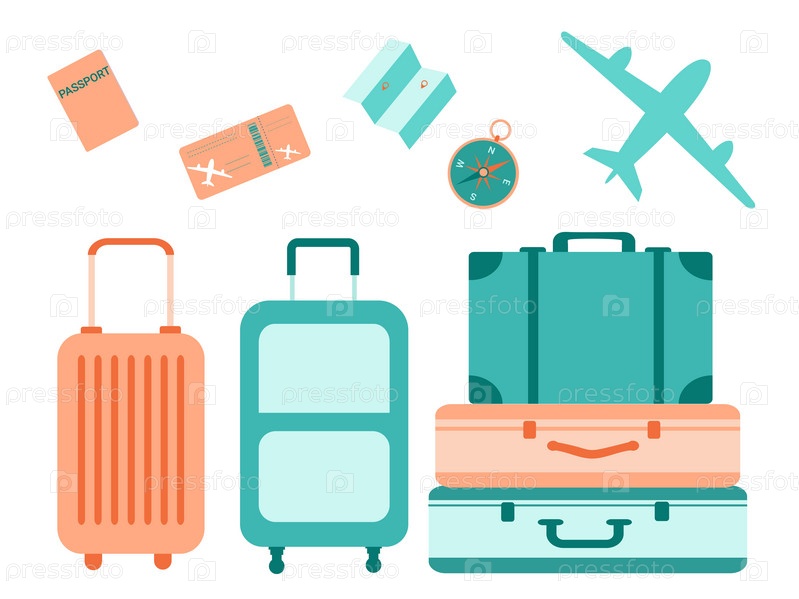 Набор чемоданов для путешествий и отдыха. Паспорт, билет на самолет, компас, карта. Красочная цветная иллюстрация