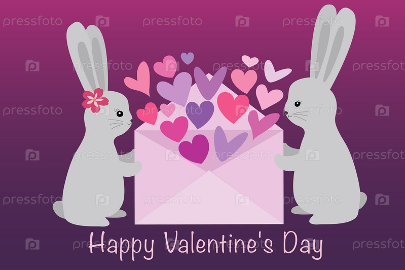 Милые кролики держат конверт с сердечками. Концепция любви. Векторная иллюстрация на розовом фоне