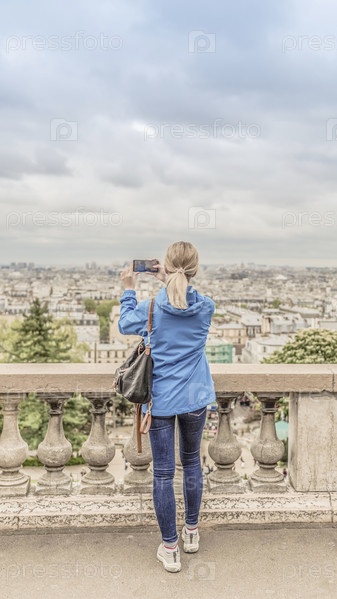 Женщина-турист фотографирует город в пасмурную погоду