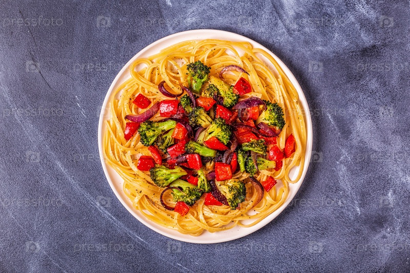 Паста с брокколи, перцем, луком