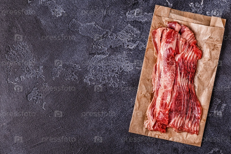 Часть сырых полосок бекона на темном фоне