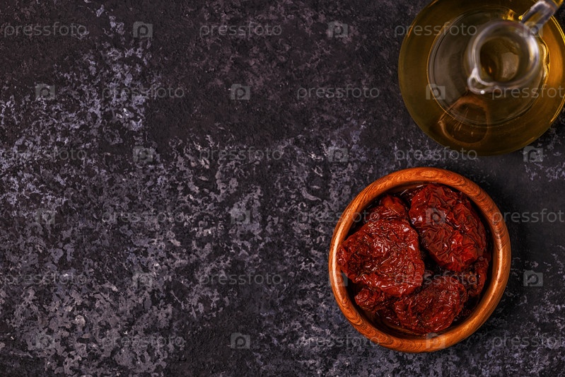 Оливковое масло, вяленые помидоры на темном фоне