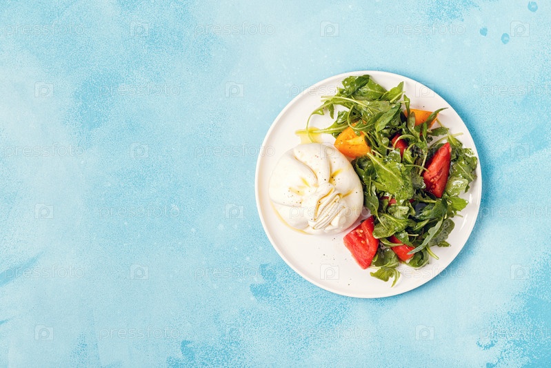 Итальянский сыр Буррата со свежей рукколой, помидорами, оливковым маслом
