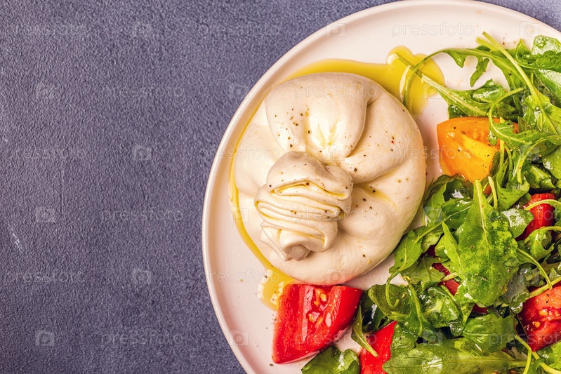 Итальянский сыр Буррата со свежей рукколой, помидорами, оливковым маслом