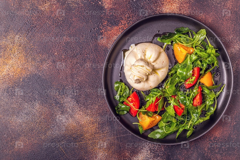 Итальянский сыр Буррата со свежей рукколой, помидорами, оливковым маслом