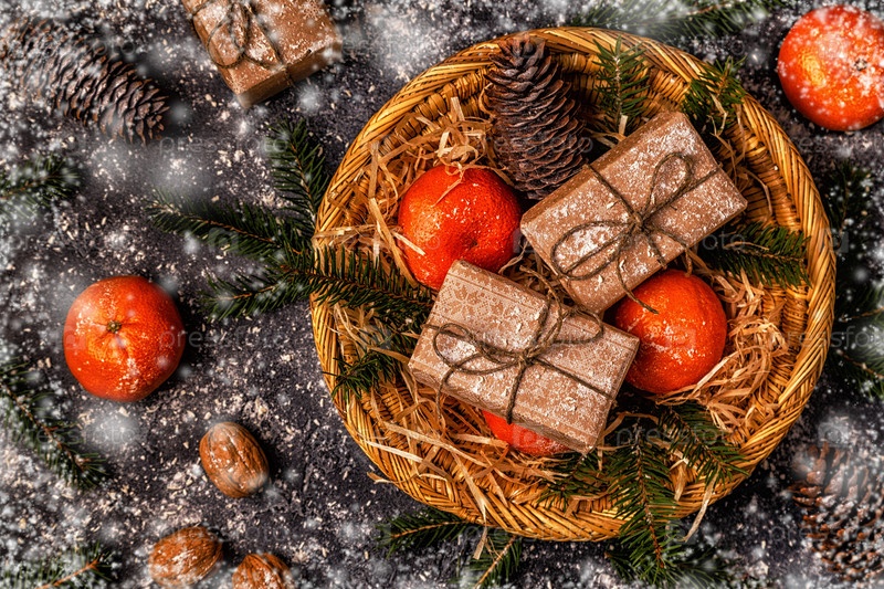 Рождественская композиция с мандаринами, подарочными коробками, шишками