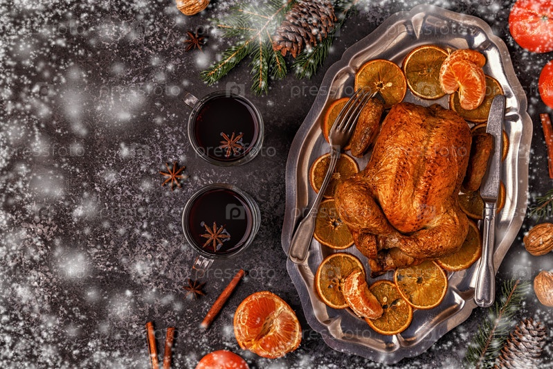Жареная целая курица с рождественским украшением