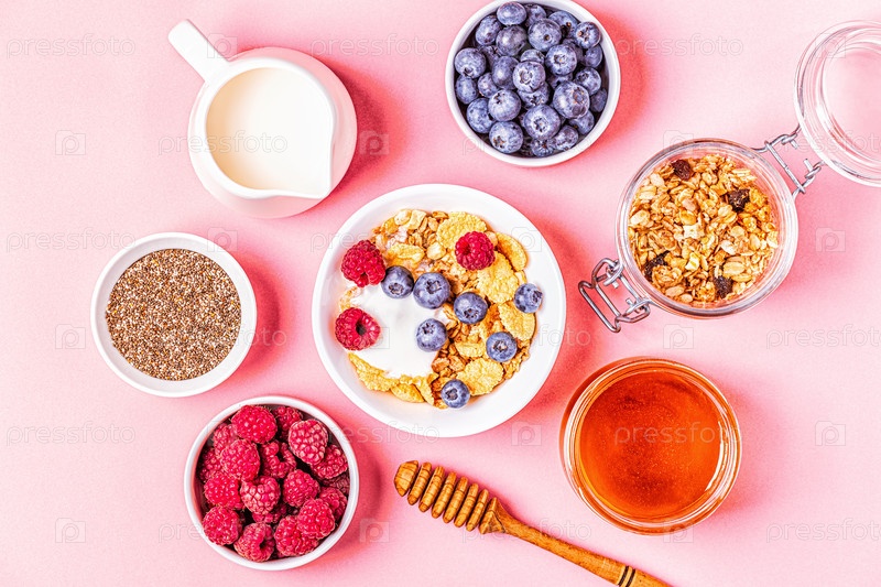 Здоровый завтрак, мюсли, хлопья с фруктами