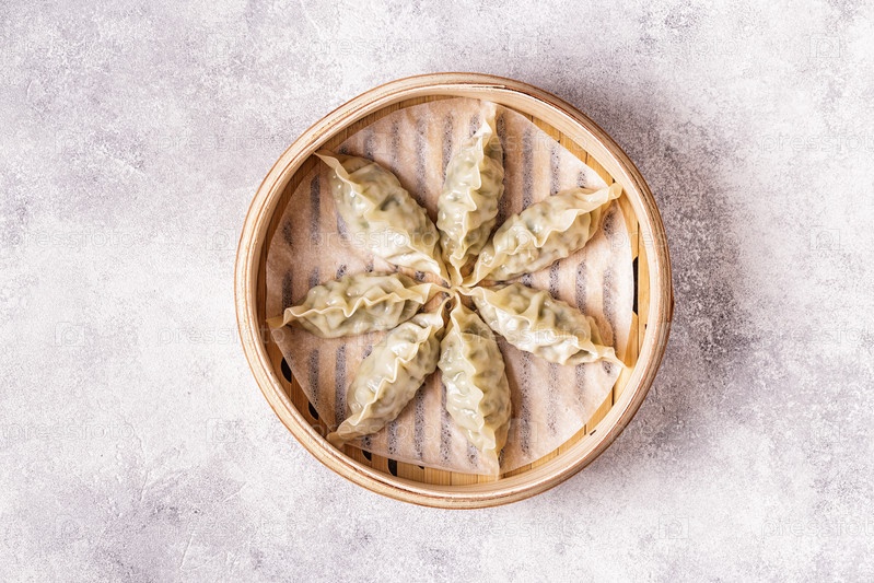 Азиатские пельмени, соевый соус, палочки для еды, вид сверху