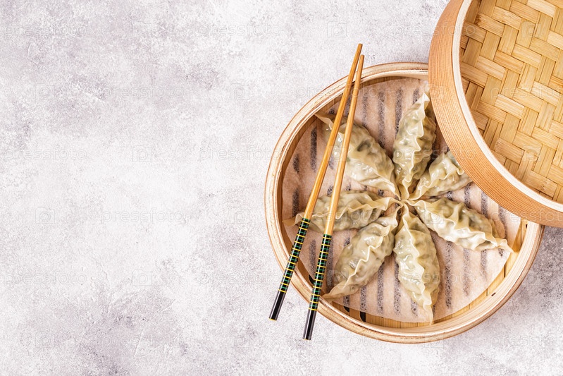 Азиатские пельмени, соевый соус, палочки для еды, вид сверху
