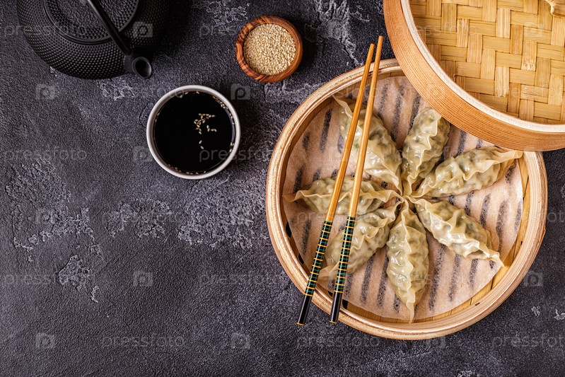 Азиатские пельмени, соевый соус, палочки для еды, вид сверху