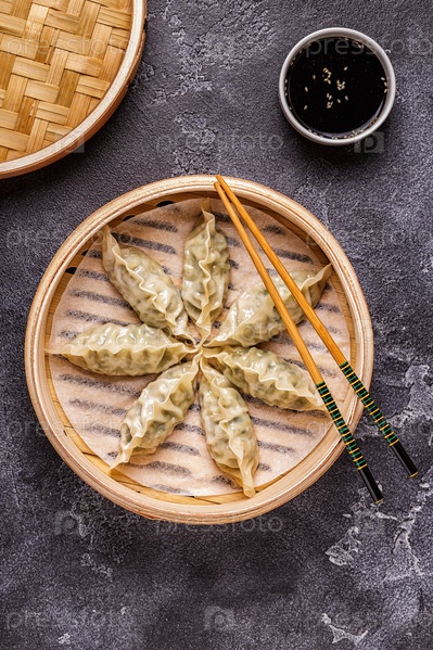 Азиатские пельмени, соевый соус, палочки для еды, вид сверху