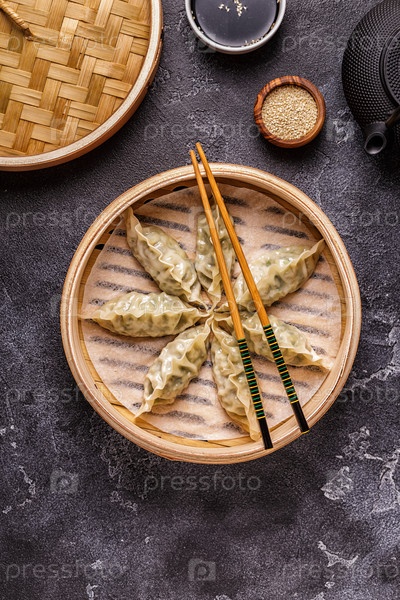 Азиатские пельмени, соевый соус, палочки для еды, вид сверху