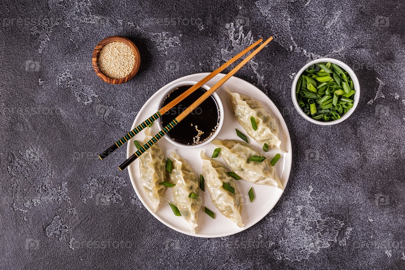 Азиатские пельмени, соевый соус, палочки для еды, вид сверху