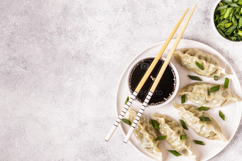 Азиатские пельмени, соевый соус, палочки для еды, вид сверху