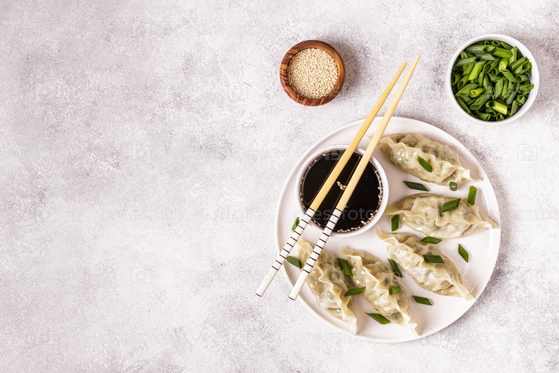 Азиатские пельмени, соевый соус, палочки для еды, вид сверху