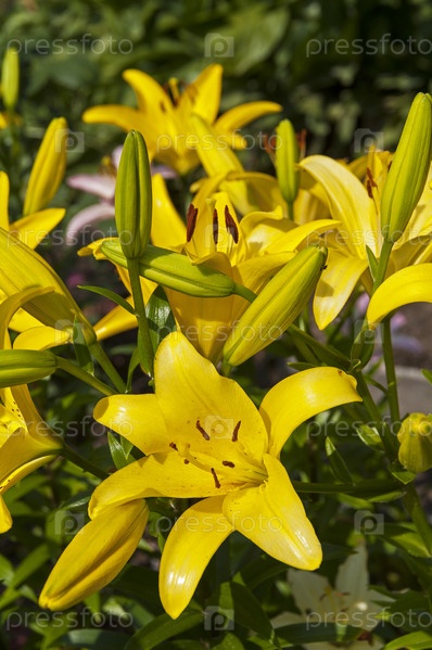 Красивые цветущие желтые лилии под ярким летним солнцем