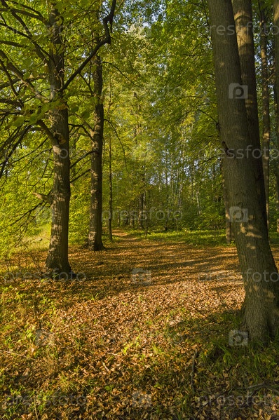 Полоски света и тени на опавшей листве на тропинке в осеннем лесу. Начало сентября. Битцевский лесопарк, Москва, Россия