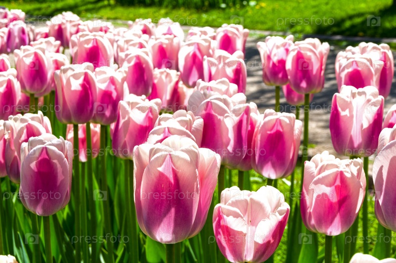 Красивые красно-белые тюльпаны на клумбе в парке. Солнечный день в мае