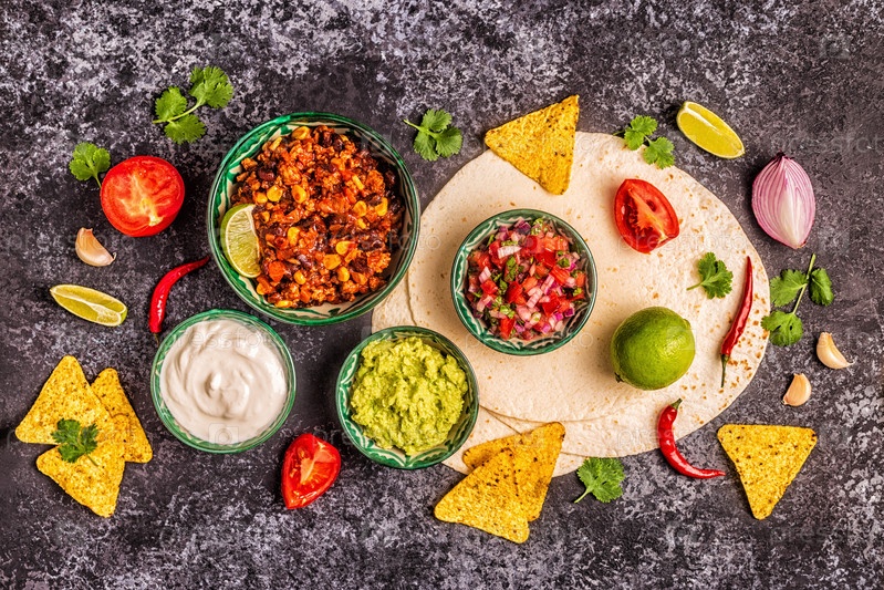 Концепция мексиканской кухни: лепешки, начос с гуакамоле, сальса