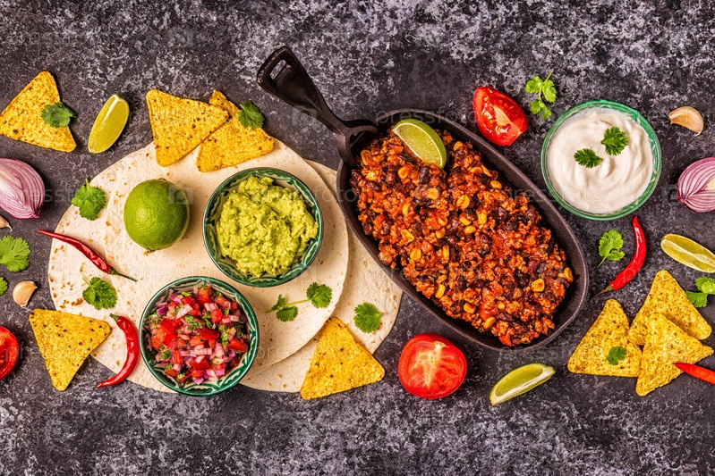 Концепция мексиканской кухни: лепешки, начос с гуакамоле, сальса