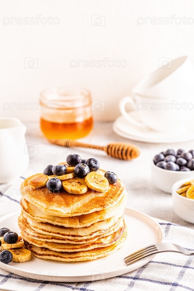 Блинчики с бананом, черникой на белой тарелке