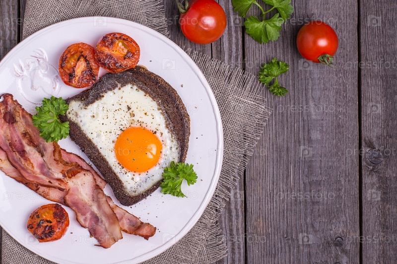 Яичница в ржаном хлебе с беконом, помидорами и петрушкой по-деревенски