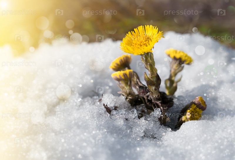 Ранняя весна. Цветущая мать-и-мачеха в снегу. Белокопытник