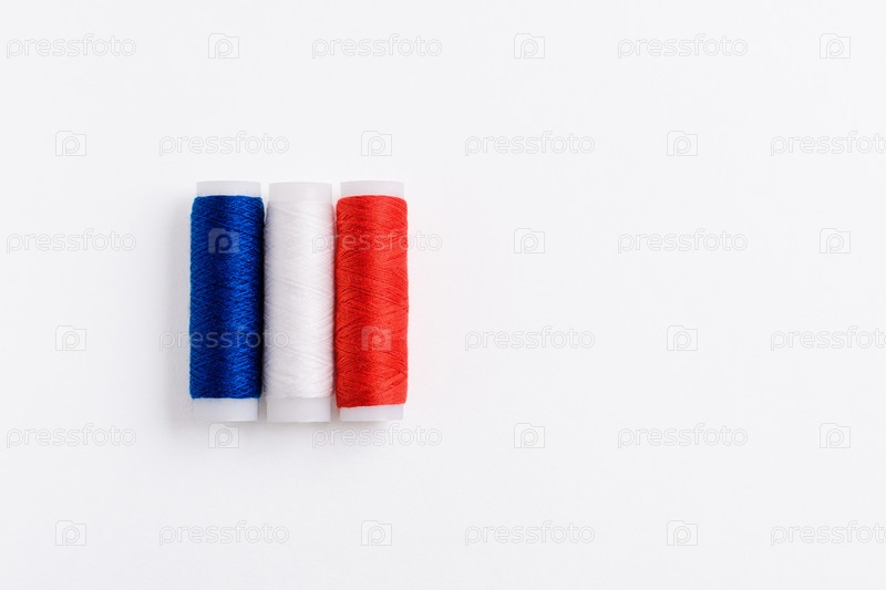Три катушки ниток для шитья сложены в виде флага Франции на белом фоне. Концепция французского патриотизма и швейная промышленность страны. Есть свободное пустое пространство. Три катушки с нитками для шитья сложены в виде флага Франции на белом фоне. Кон