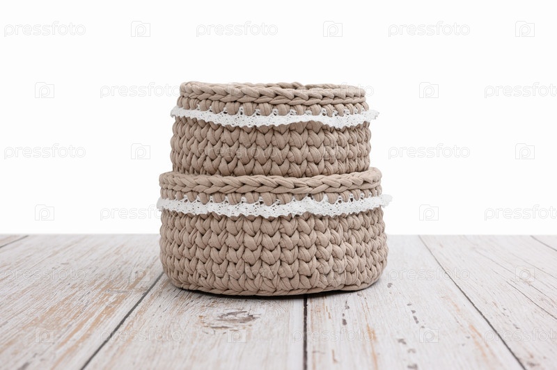 Две пустые вязаные бежевые корзины стоят в виде башни на столе на белом фоне. Изолированный фон