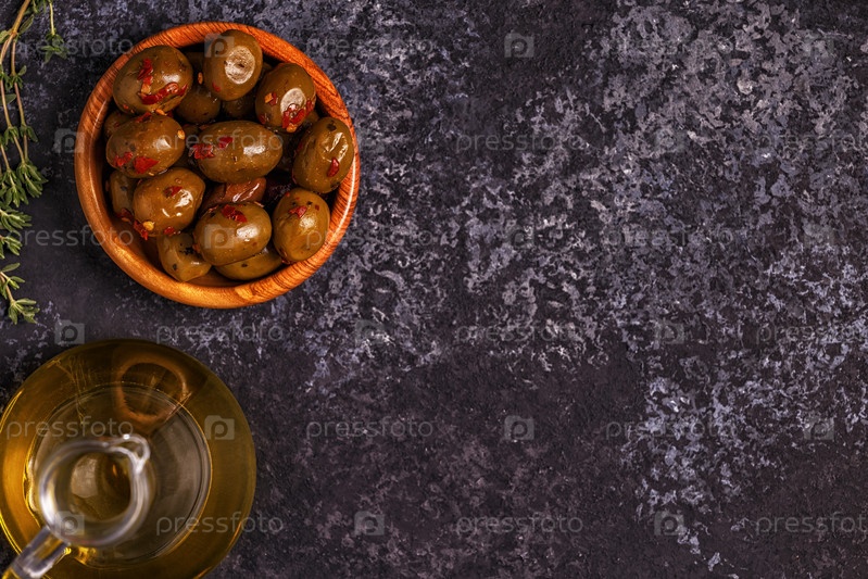 Оливковое масло, оливки на темном фоне