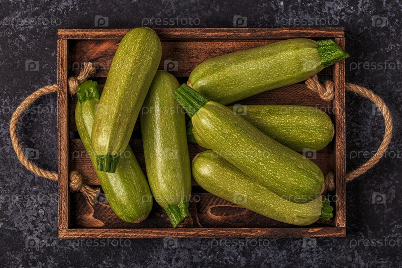 Свежие здоровые зеленые кабачки цуккини в коричневой деревянной коробке