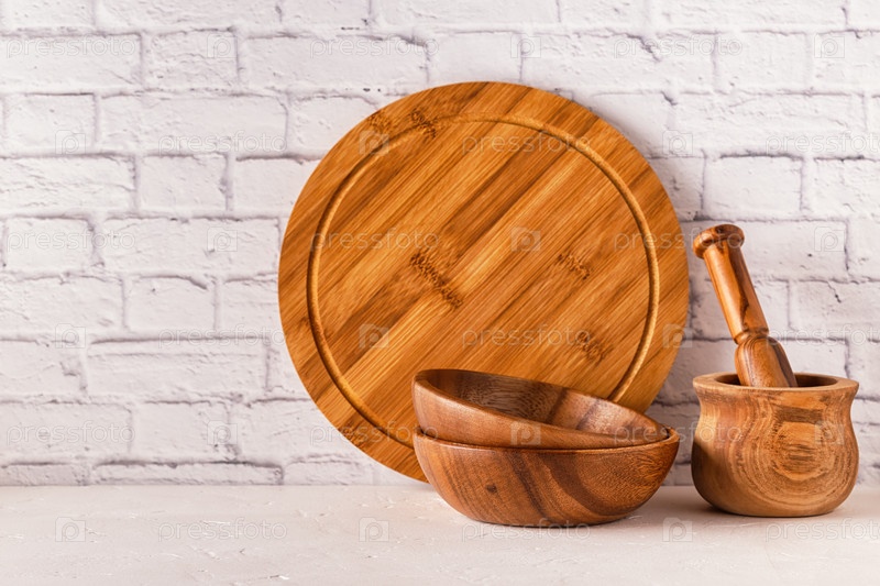 Деревянная посуда на белом столе