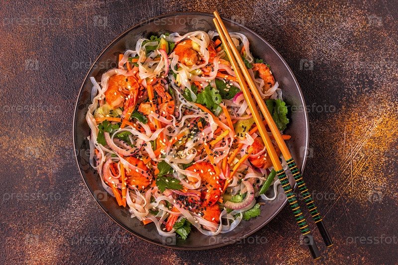 Азиатский салат с рисовой лапшой, креветками и овощами