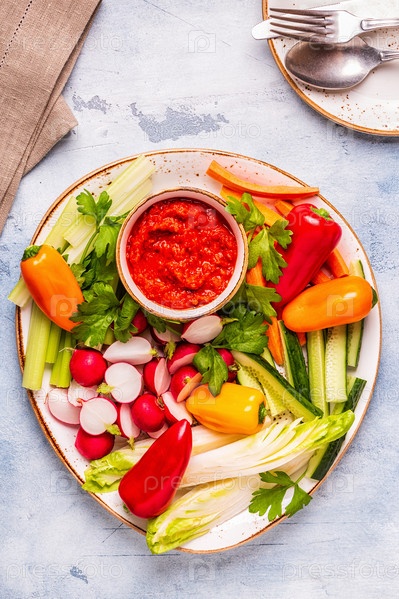 Тарелка со свежими, сырыми овощами и соусом