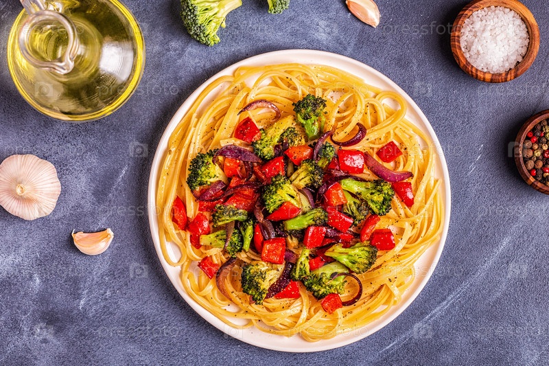 Паста с брокколи, перцем, луком