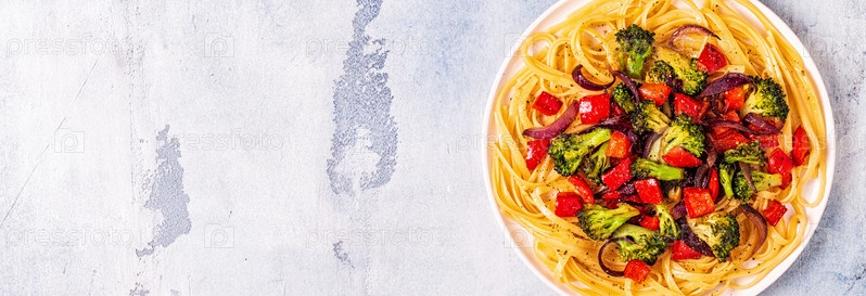 Паста с брокколи, перцем, луком