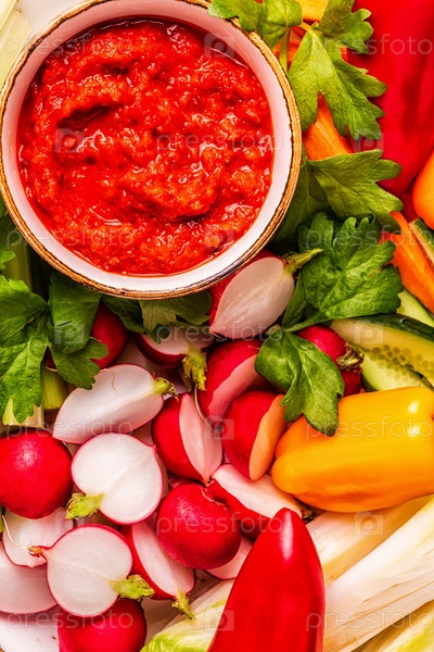 Тарелка со свежими, сырыми овощами и соусом