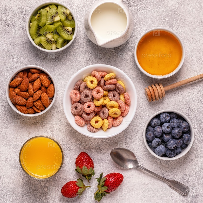 Завтрак с красочными кольцами хлопьев, фруктами, молоком, соком