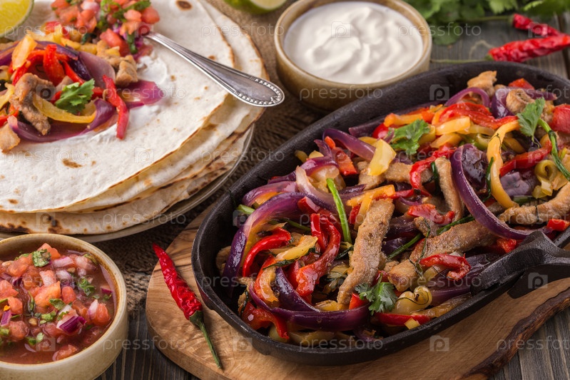 Фахитас из свинины с луком и цветным перцем, подается с лепешками, сальсой и сметаной