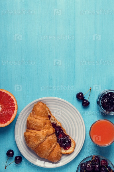 Завтрак с круассаном, джемом, фруктами и соком