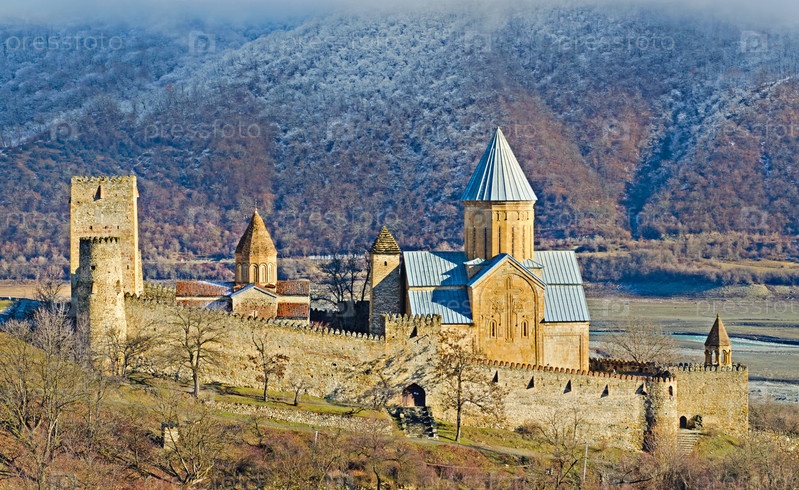 Вид средневековой крепости Ананури с грузинской военной дороги