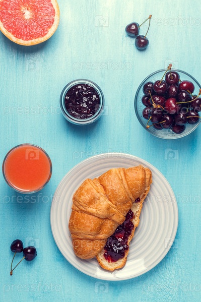 Завтрак с круассаном, джемом, фруктами и соком