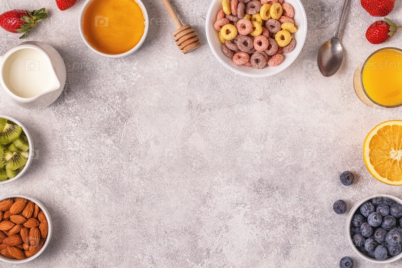 Завтрак с красочными кольцами хлопьев, фруктами, молоком, соком