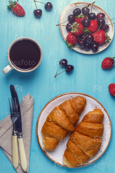 Завтрак на синем - круассан, фрукты и кофе