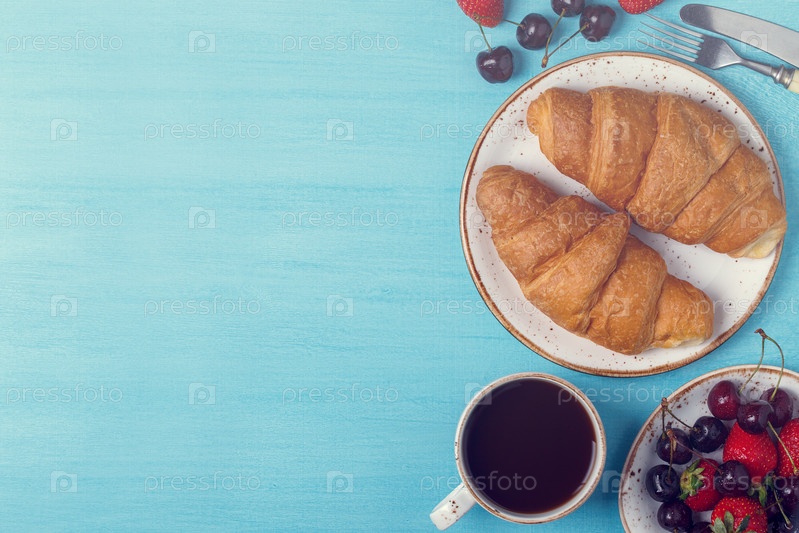 Завтрак на синем - круассан, фрукты и кофе