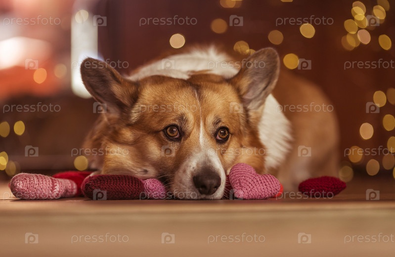 Милый портрет собаки корги лежит на полу среди алых и розовых сердец